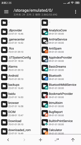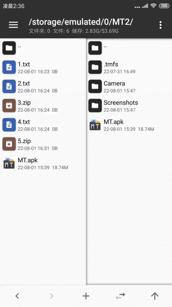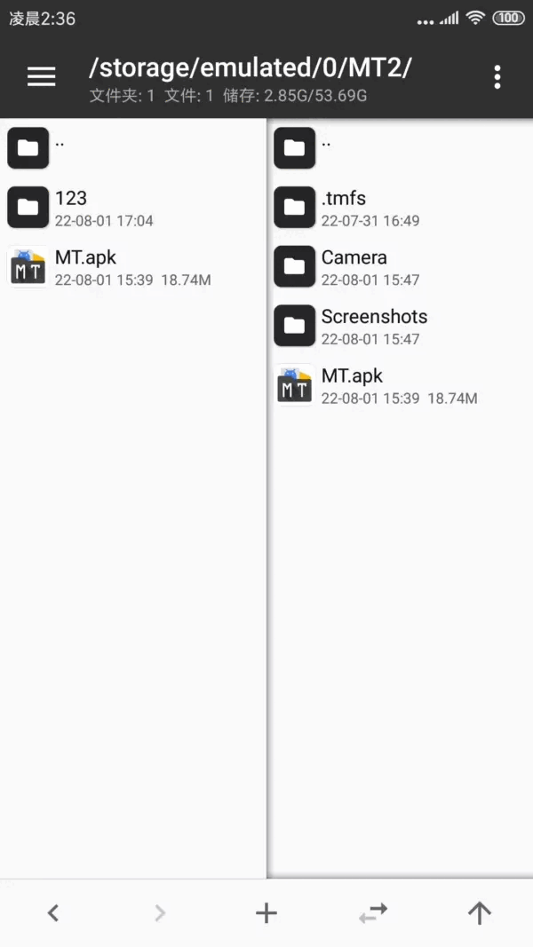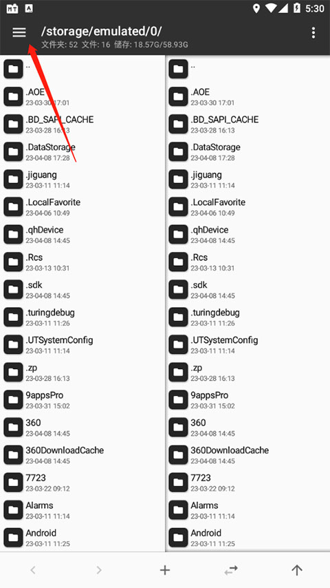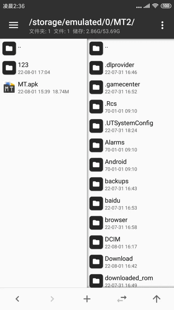 进入MT管理器,首先看到的是左右两个文件列表窗口。