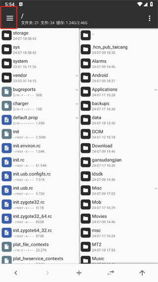 1、首先打开mt管理器软件,进入到首页中后可以看到很多的内容,我们在这里点击左上角的【三横图标】;