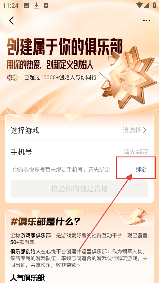 3、进入创建俱乐部页面,若提示需绑定手机号,就点击【绑定】按钮,进入手机号绑定界面,为创建俱乐部做准备。