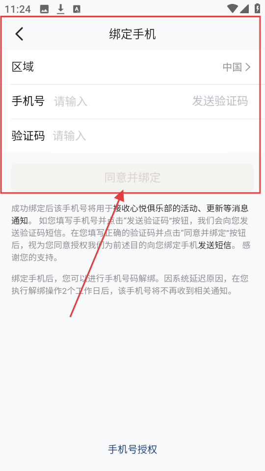 4、在绑定手机界面,选择区域,输入手机号,获取并填写验证码,最后点击【同意并绑定】,就能完成手机号绑定,继续创建俱乐部啦。