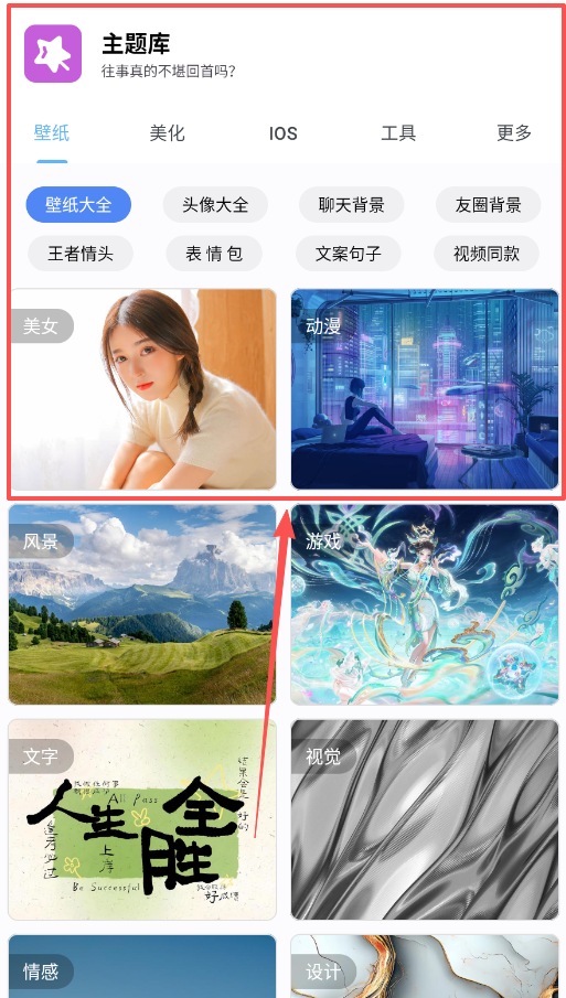 1、主界面导航清晰,从“壁纸”到“更多”分类明确,你可以先从“壁纸大全”或“头像大全”入手,快速找到心仪的图片并设为壁纸。