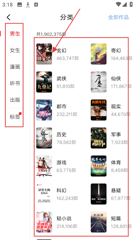 1、在软件界面,点击【分类】选项,进入分类页面,可看到男生、女生等分类,以及玄幻、奇幻等具体类别。