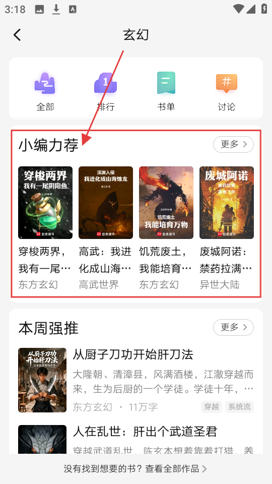3、进入玄幻类别书籍列表页后,“小编力荐”区域有推荐书籍,挑选心仪的,点击进入书籍详情页。