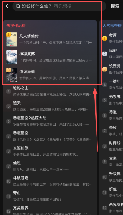 4、别忘了利用强大的标签系统,人气标签榜里包含了升级流、群像、千禧年等关键词。