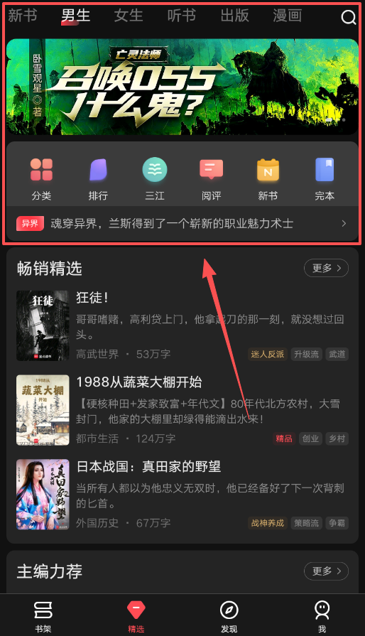 2、进入首页后,可以先看看顶部的分类导航,像新书、男生、女生等,方便你快速找书。