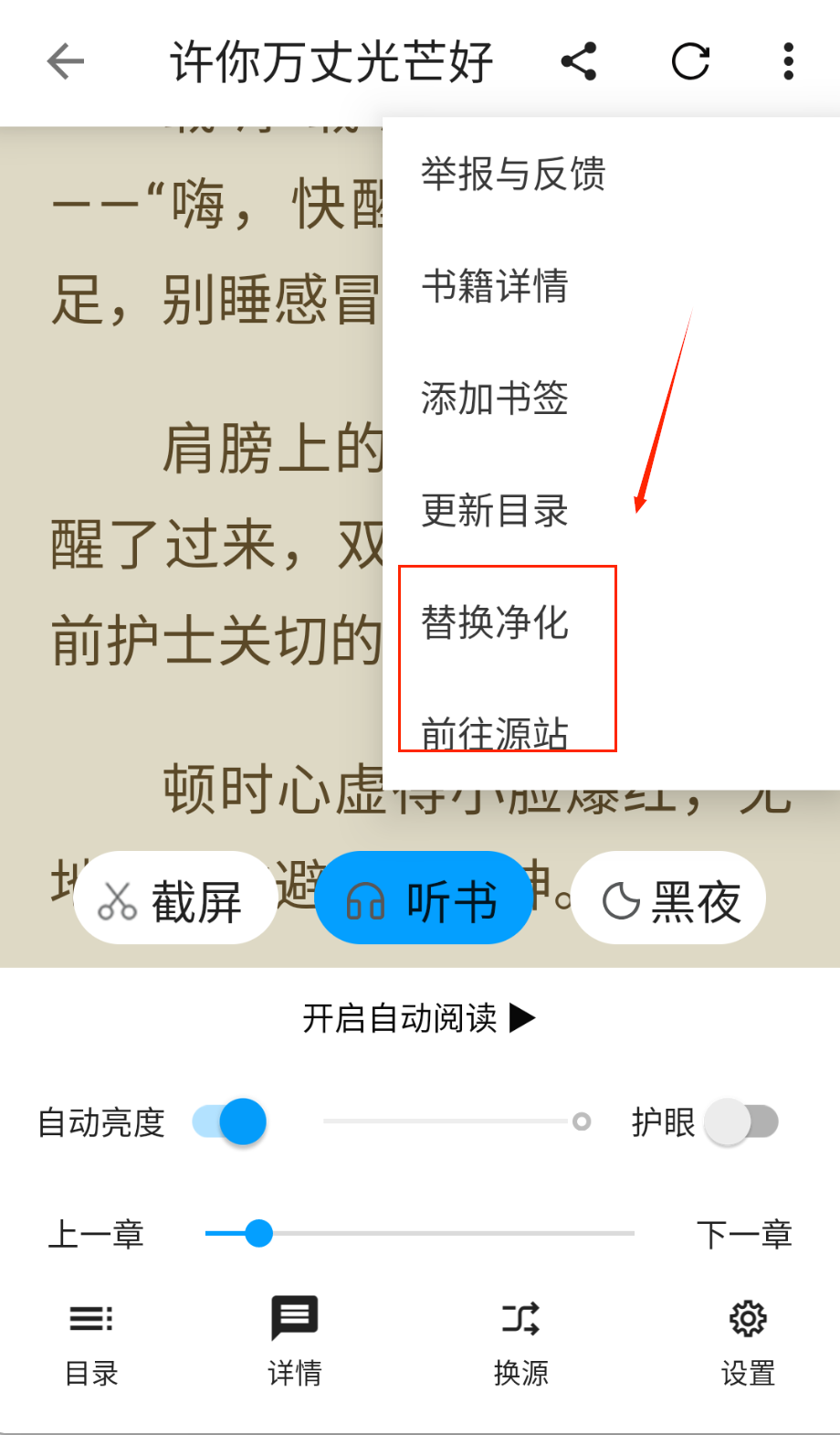 3、阅读时记得使用目录功能查看全书章节,通过换源可以切换不同网站的书源,选择更新最快错误最少的源能提升阅读体验呀。