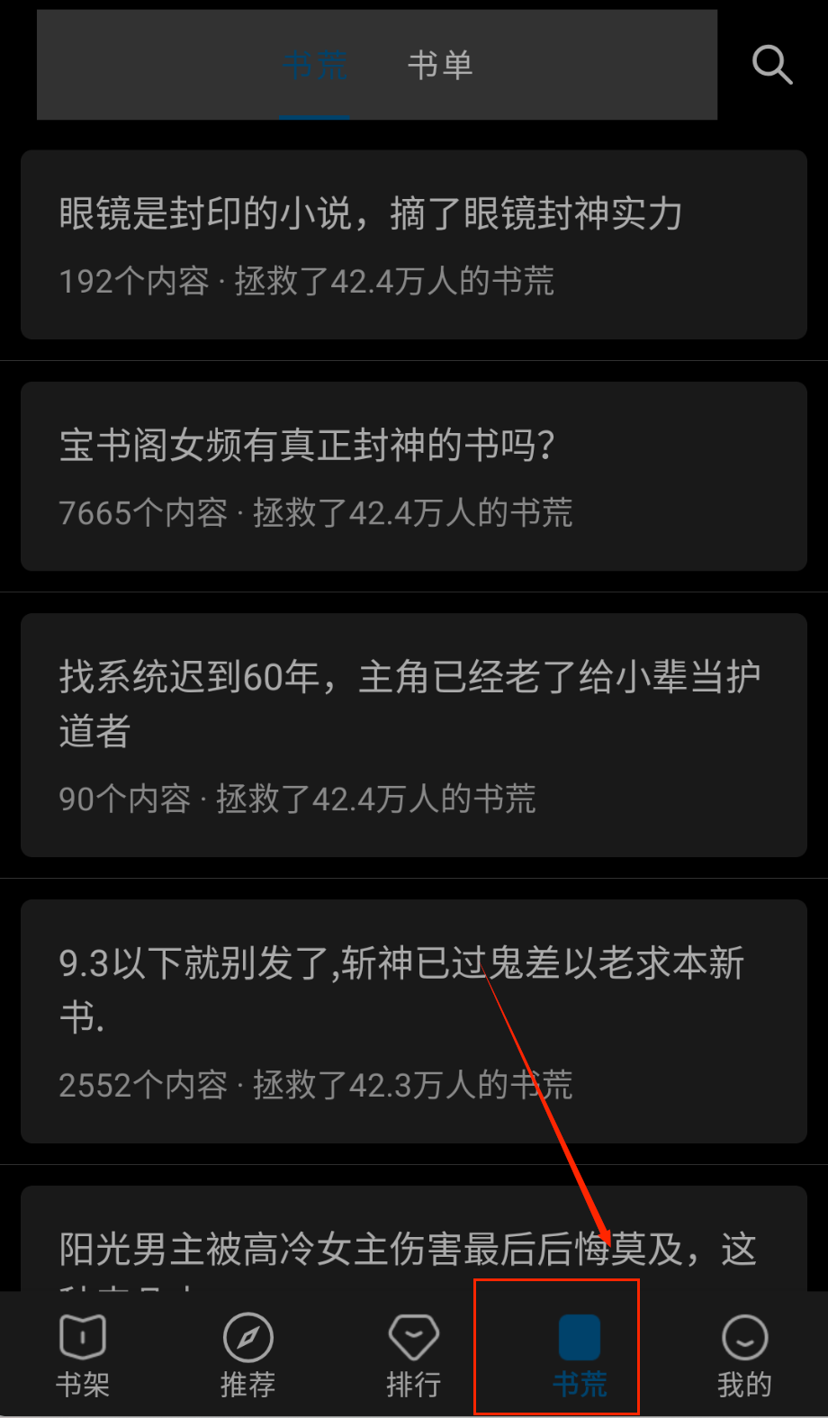 2、在书荒页面可以看到很多书友分享的书单,这些书单都标注了拯救书荒的人数,选择高人气的书单能帮你快速找到优质小说哦。