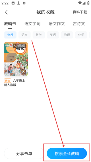 2、进入教辅资源页后,点【搜索全科教辅】按钮,可进入教辅搜索页面,查找更多对应学科的教辅啦。