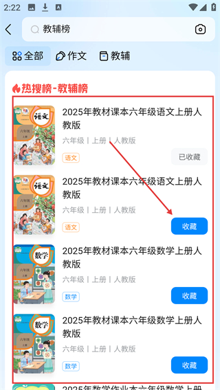 3、在教辅搜索页,能看到各学科的教辅资源列表,选目标教辅后点【收藏】按钮,可把资源存到我的收藏里呢。