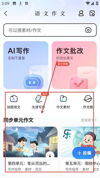 1、在APP首页,点击【语文作文】功能入口,进入作文专项界面,可获取写作相关的指导与素材啦。