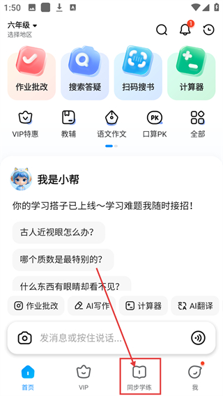 1、在应用首页,点底部的【同步学练】选项,能进入学科练习页面,开启对应科目的练习啦。