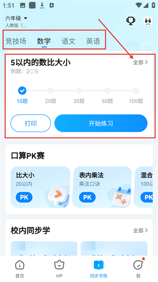 2、进入同步学练页后,选目标学科(比如数学),再选对应知识点模块,就能看到具体的练习内容哦。