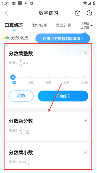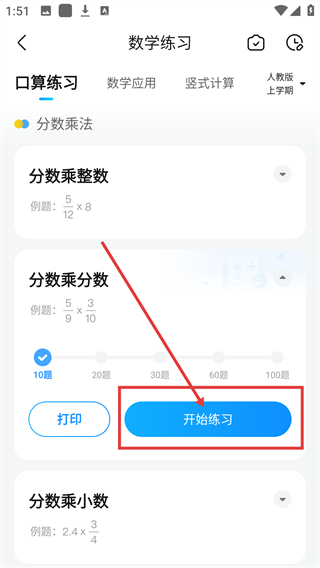 3、进入数学练习页后,可选择不同的知识点(像分数乘整数、分数乘分数),按需挑选练习模块呢。