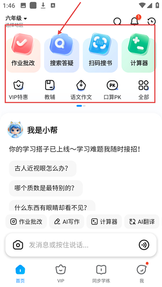 1、进入学习工具主界面后,点击【搜索答疑】功能,就能开启学习难题的查询辅助啦。