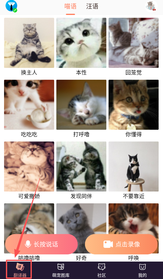 1、开启翻译功能需先进入“翻译器”板块,选择喵星人或汪星人语言模式,长按录音按钮采集宠物叫声。