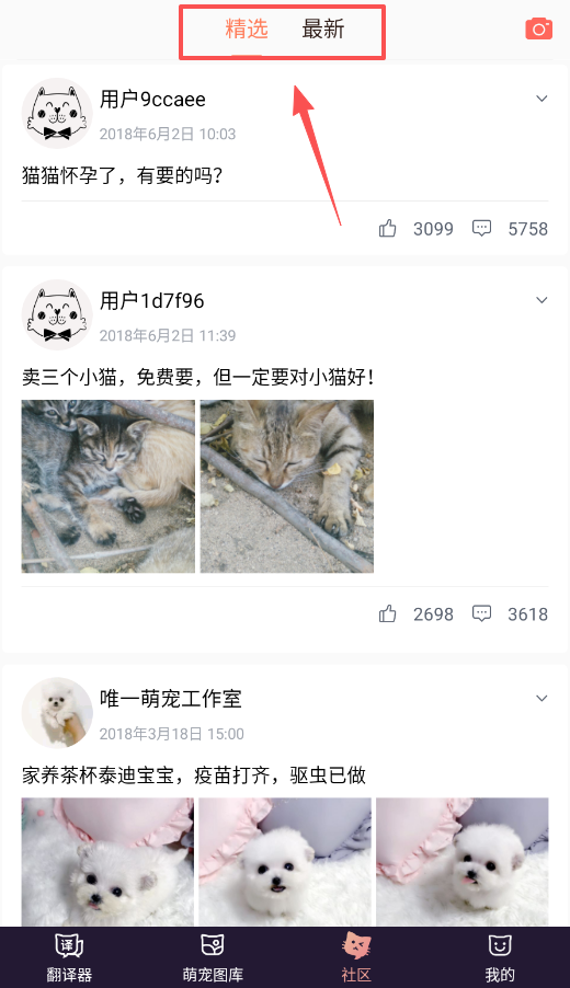 2、社区模块分为“精选”与“最新”双时间线,用户可浏览宠物领养启事、养护经验分享等UGC内容。