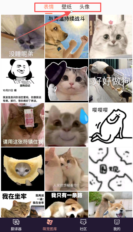 3、萌宠图库采用卡片式瀑布流设计,涵盖表情包、手机壁纸、社交头像三类素材,支持即点即存功能。
