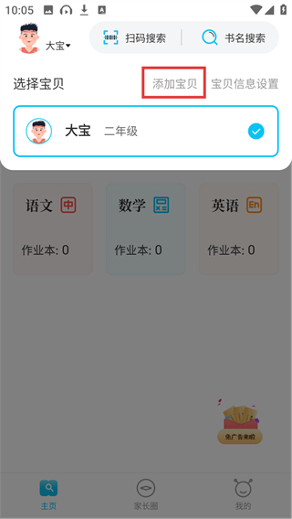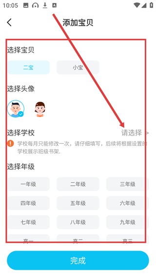 3、在添加宝贝页面,需选择宝贝名称、头像、学校和年级,填好信息才能完成添加哦。