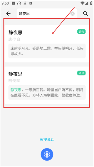 3、在搜索框输入【静夜思】后,会出现不同作者的《静夜思》结果,选择目标条目就能查看详情啦。