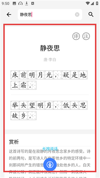 4、点击目标《静夜思》条目,就能进入详情页,查看诗句原文、作者信息还有赏析内容哦。