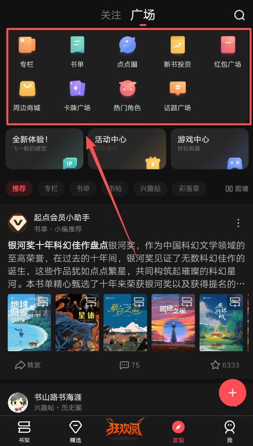 2、在发现页面中,书单、专栏和话题广场提供了读者交流的平台,比如可以查看银河奖科幻盘点这样的主题书单。