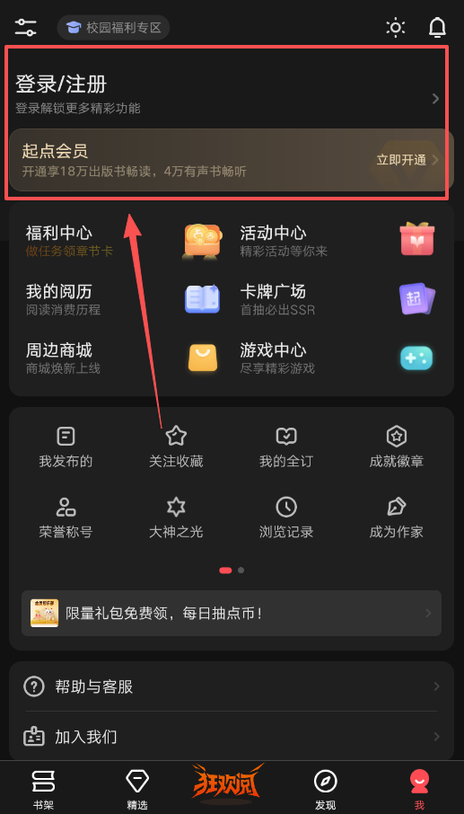 3、通过手机号或第三方账号登录后,可以解锁完整功能,在我的页面,你可以考虑开通起点会员获取更多权益。