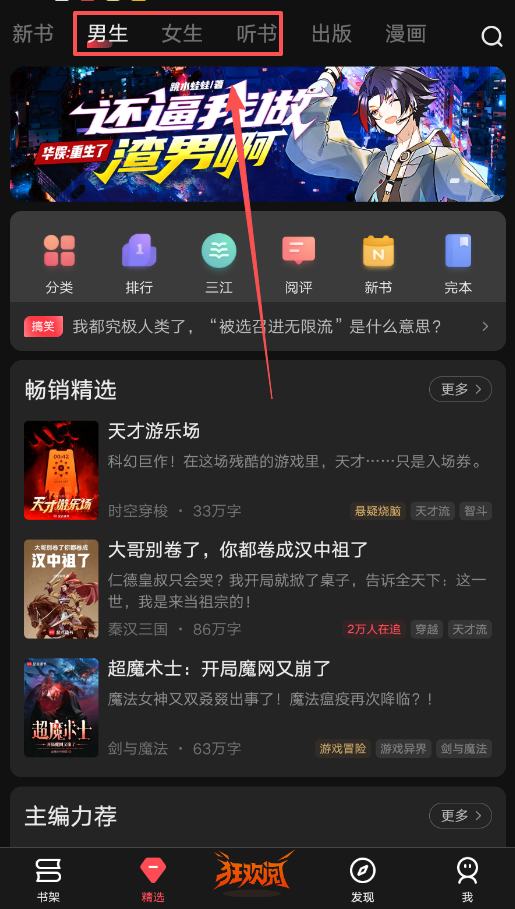 1、打开软件,首先能看到顶部的类型分类,比如男生、女生和听书,帮你快速找到想看的大类。