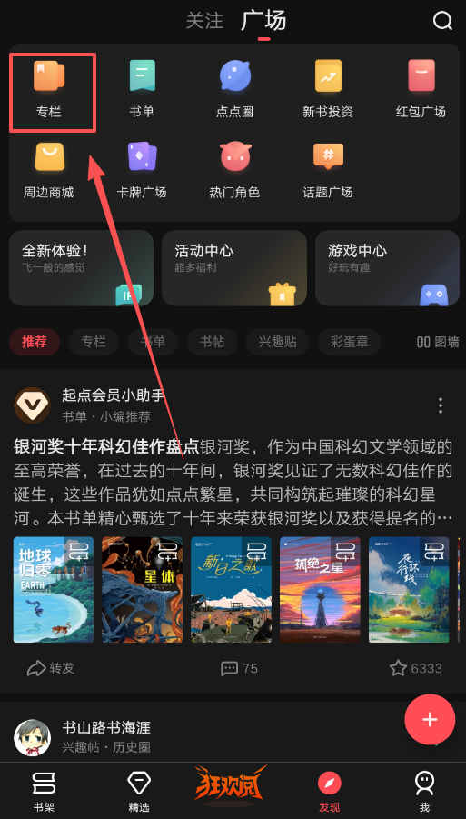 2、想看更多推荐或参与互动,可以点开发现页。这里有书单和专栏,能发现别人整理的好书合集。