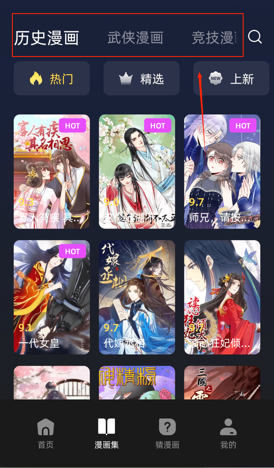 1、在漫画集页面可以同时使用多个筛选条件,比如选历史类再加热门标签,能精准找到经典高分作品,提高找书效率。