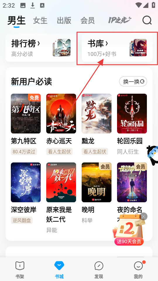 1、在软件书城页面,找到【书库】选项,点击它就能进入书库,这里有超100万本好书可供挑选。