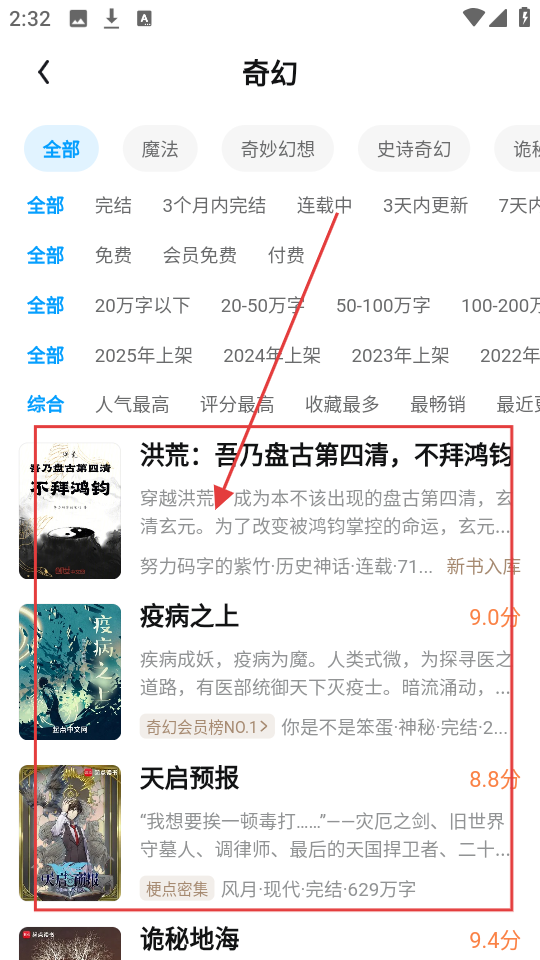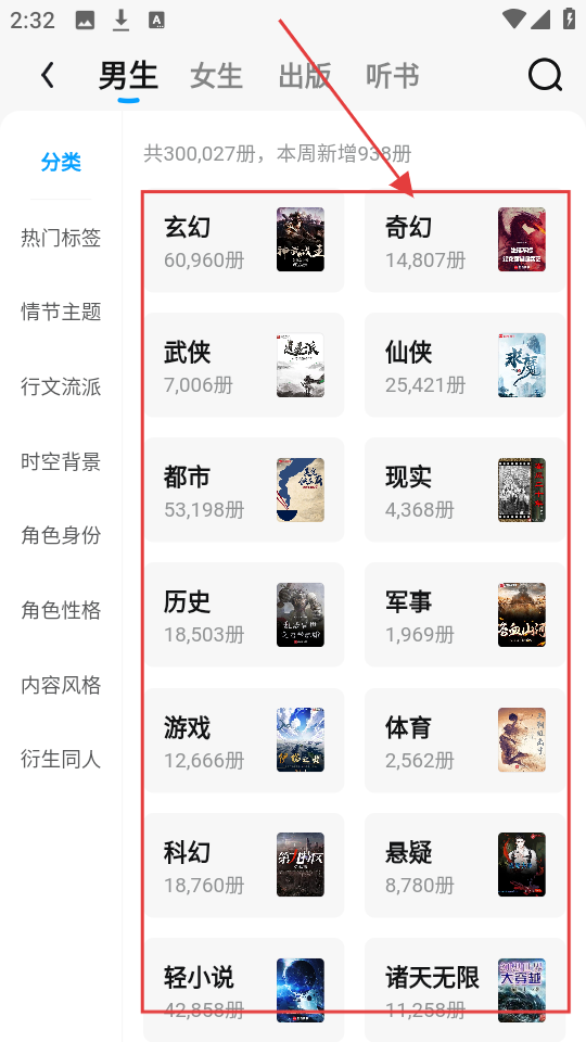 2、进入书库后,能看到各类书籍分类,像玄幻、奇幻等,选择感兴趣的分类,点击进入该分类书籍列表页哦。