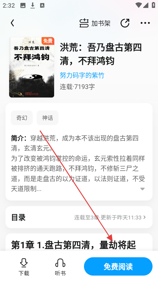 4、进入书籍详情页后,若想阅读,点击【免费阅读】按钮,就能进入阅读界面,开始阅读书籍啦。