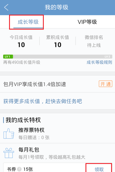 9.接下来,请大家点击页面中的“等级”菜单选项,点击之后即可查看到等级状况,然后在页面底部我们可以看到领取每月大礼包的按钮。