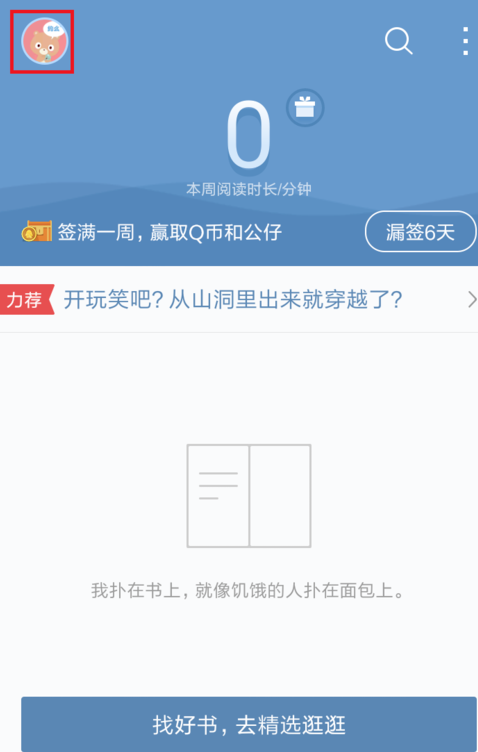 7.接下来,还有一个免费获得书券的途径,这个途径我们可以每月领取一次。打开QQ阅读主页面,使用对应的账号登录之后,点击页面左上角的头像。