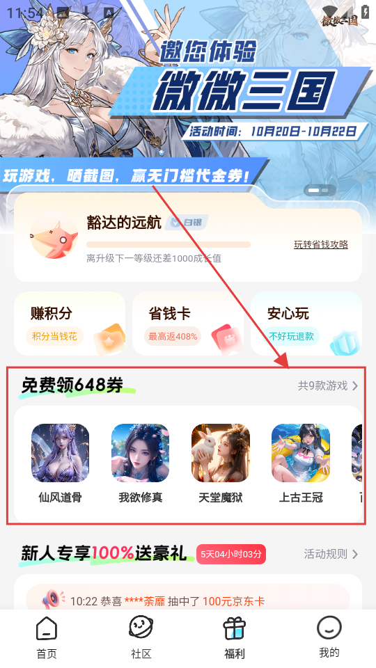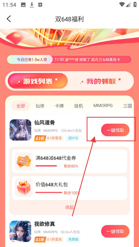 2、进入福利页面,找到【免费领648券】区域,选一款想领福利的游戏,比如《仙风道骨》,点击它。