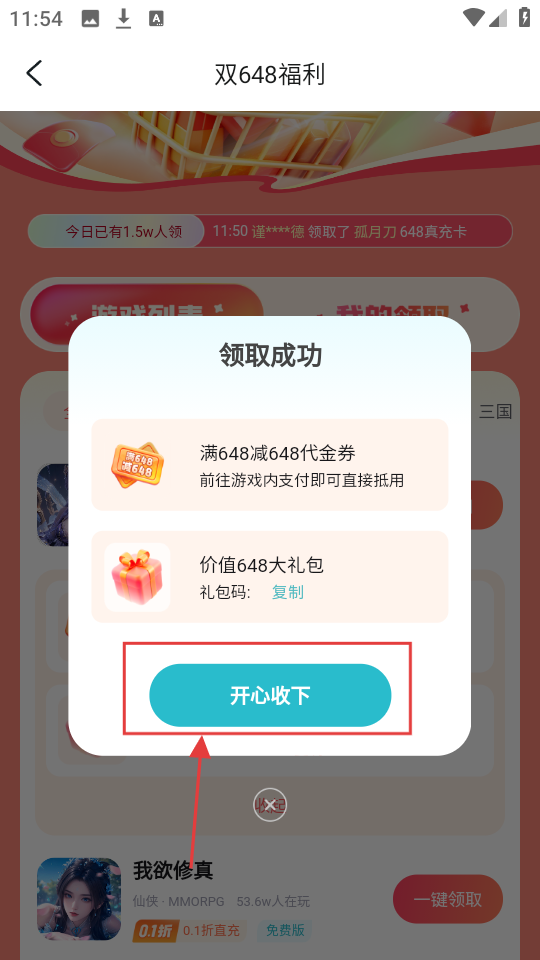 4、领取成功后,会弹出提示框,点击【开心收下】,就成功领取福利,快去游戏里使用吧。