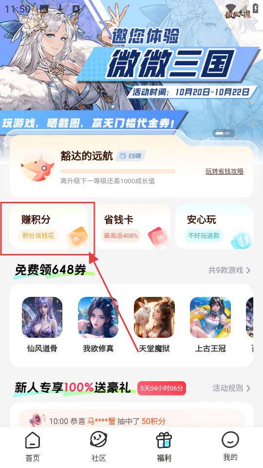 2、在福利页面,若想赚积分,点击【赚积分】,就能进入福利宝库页面哦。
