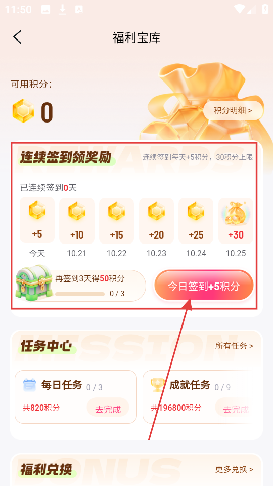 3、进入福利宝库页面,若想签到领积分,点击【今日签到+5积分】,就能完成签到,获得积分呢。