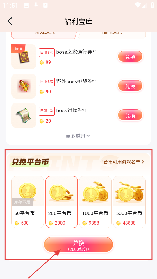 4、积累足够积分后,在福利宝库的兑换平台区域,若想兑换平台币,选择要兑换的平台币数量,点击【兑换】,就能完成兑换啦。