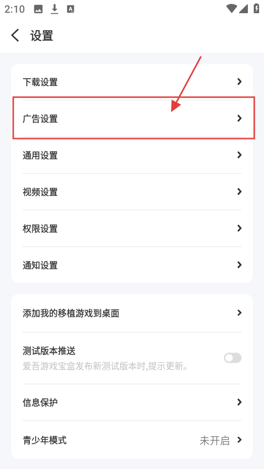 2、进入设置后,点击【广告设置】,就能调整广告相关选项啦。