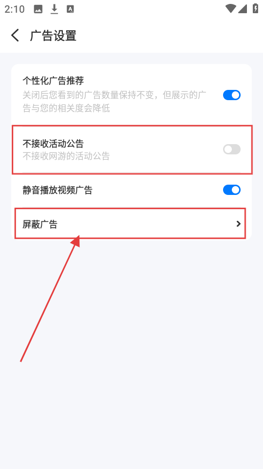 3、在广告设置里,点击【屏蔽广告】,进入具体的广告屏蔽设置页面哦。