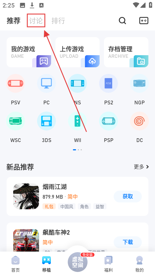 1、在页面顶部找到【讨论】选项就点击进入哦,这是参与游戏讨论的入口呢。