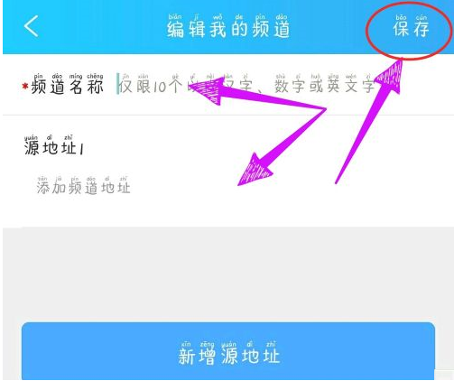 6、输入频道名称,粘贴频道地址,点击保存就可以自建一个新频道了(如图所示)。