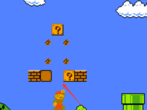 1、以第一关为例,首先,顶砖块,会出现一个蘑菇,吃掉