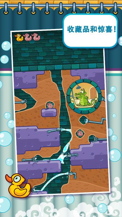 1、鳄鱼爱洗澡中文版游戏里拖动水龙头控制水流的大小,用肥皂泡沫清洗鳄鱼的身体。