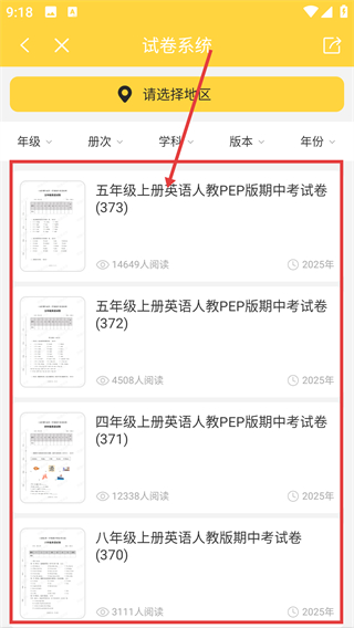 2、进入试卷系统后,选择年级、学科等条件筛选,就能看到匹配的试卷列表,方便找到需要的试卷哦。
