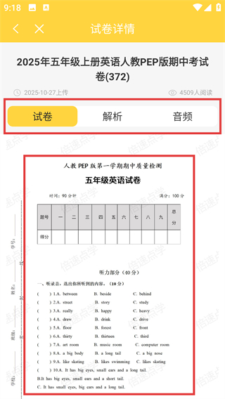 3、点击目标试卷进入详情页,默认展示【试卷】标签下的试题内容,可直接查看完整的试卷题目啦。