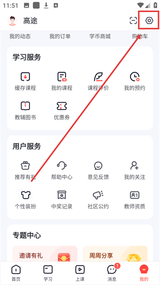 1、在高途“我的”页面,点右上角的设置图标,能进入设置界面,调整各类功能的配置参数哦。