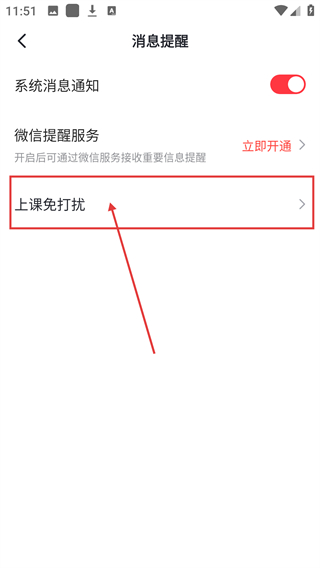 3、在消息提醒页,点【上课免打扰】选项,能进入对应的功能设置界面,调整上课期间的通知权限呢。