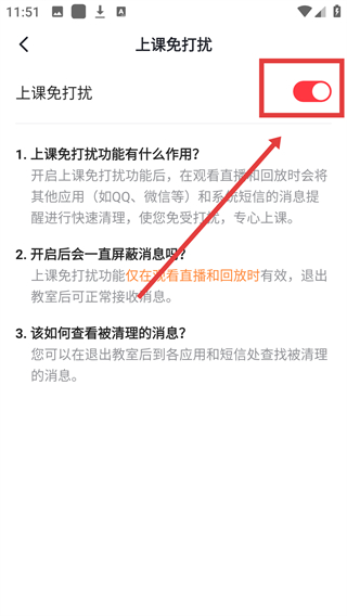 4、在上课免打扰页,点击功能开关后,就可以把免打扰关闭啦。